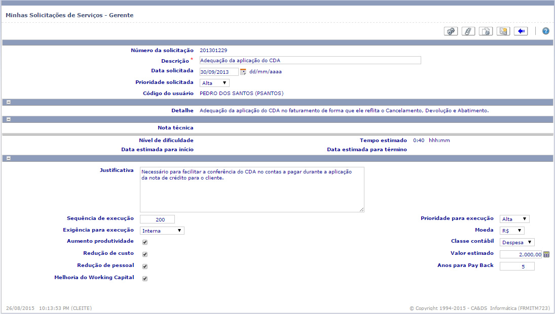 O Cadastro Mestre de Solicitações de Serviços (CMSS) é módulo dentro do CADS-ITM que permite o registro e controle de todas as solicitações de serviços relacionadas com os recursos e sistemas administrados por TI.