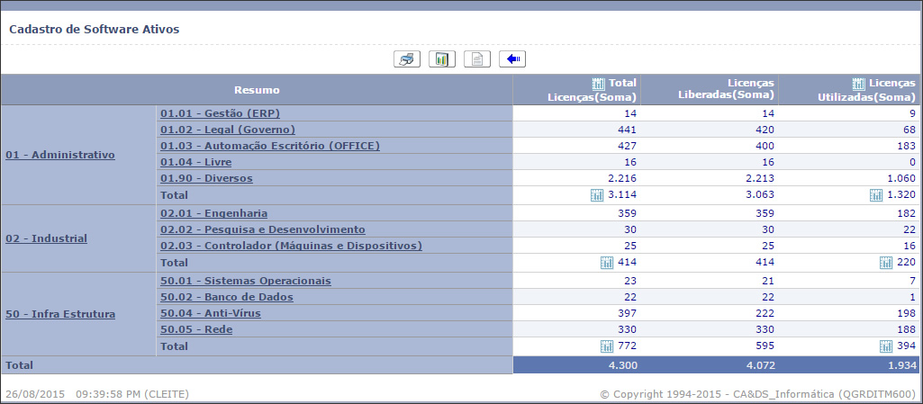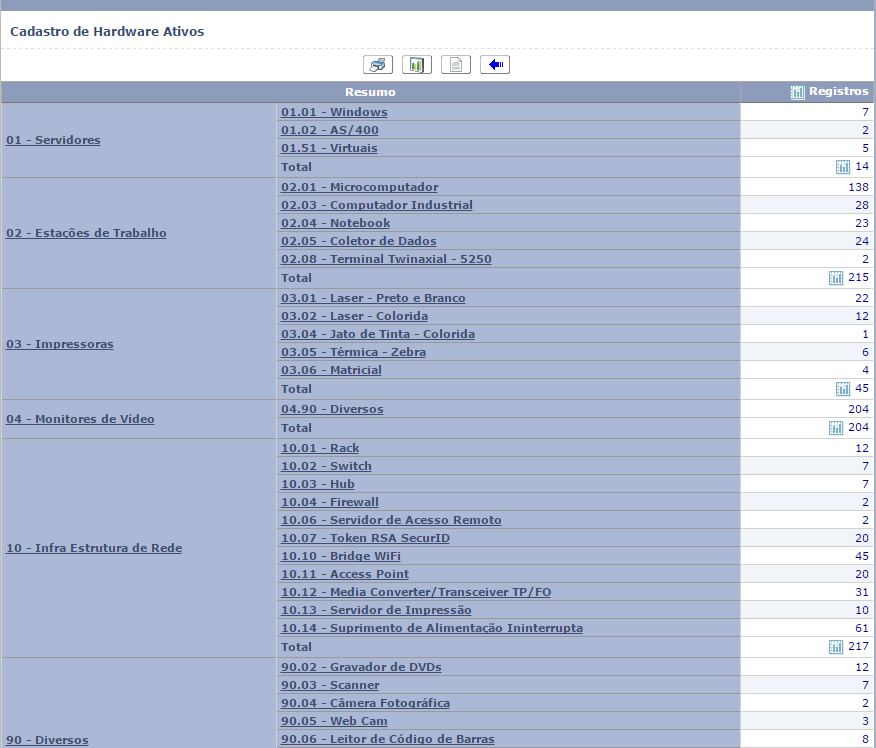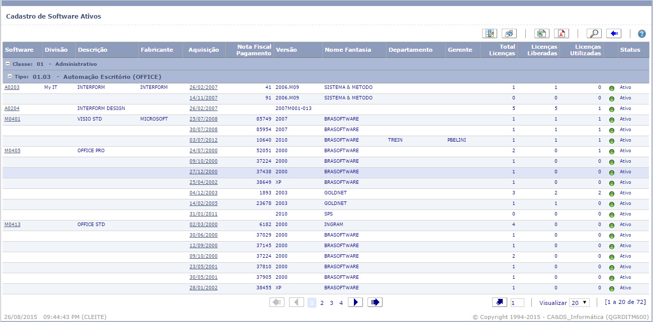 Todos os softwares poderão ser identificados e controlados com informações da compra, garantia, configuração técnica, onde estão instalados, etc.