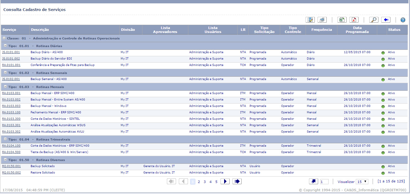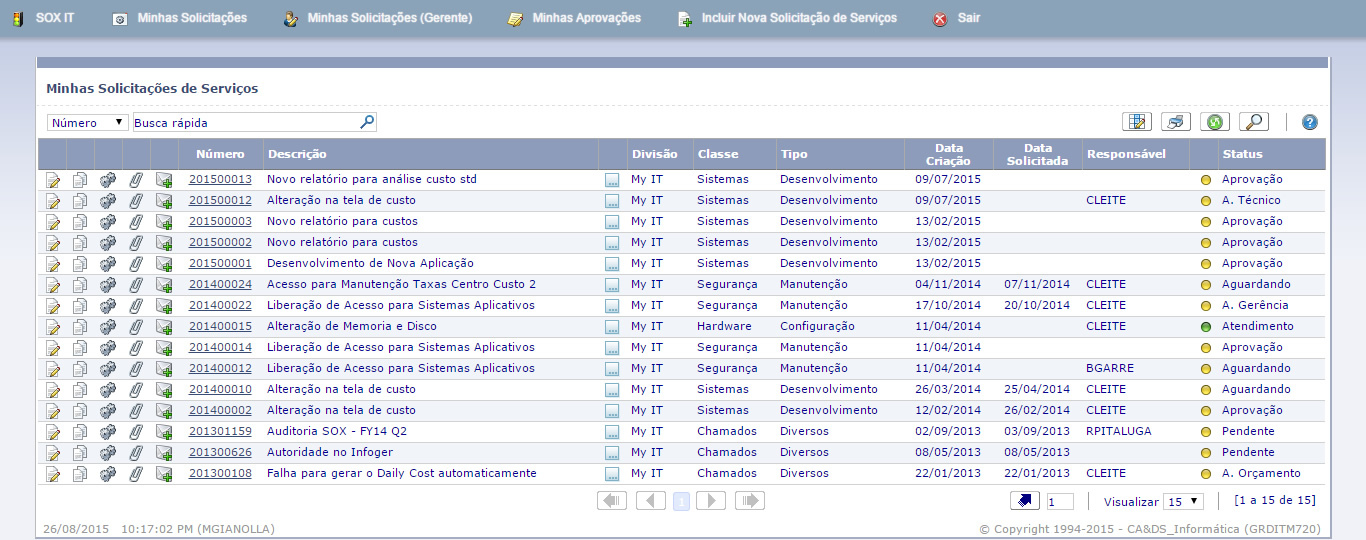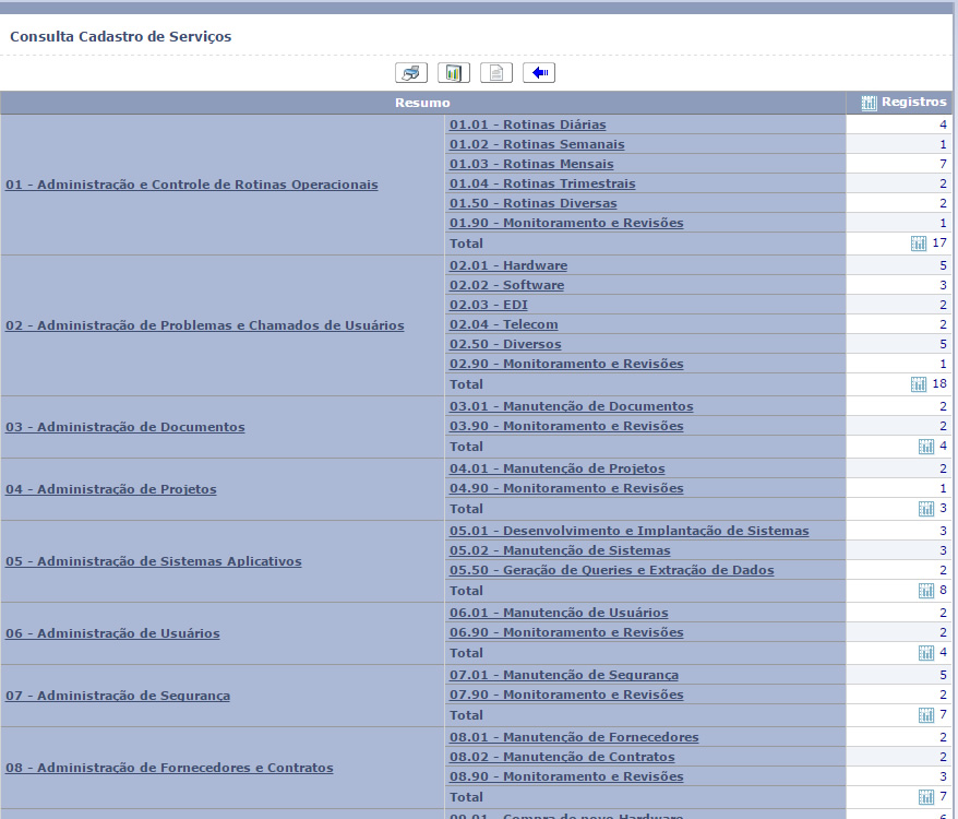 Cada serviço poderá ser registrado e relacionado com os documentos de apoio, controles SOX, dados requeridos e ações padrões para execução do serviço.