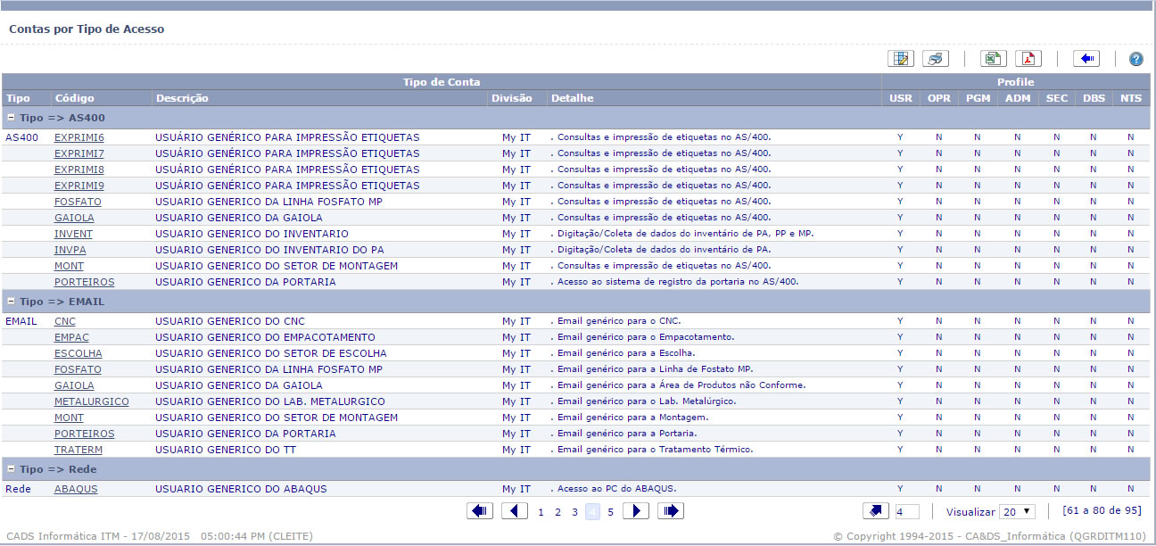 • Documentação do perfil de segurança configurado para cada conta de acesso.