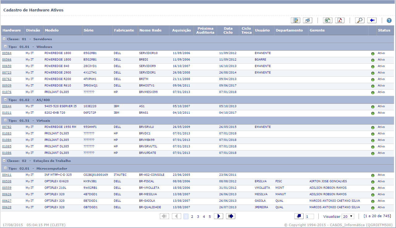 Todos os equipamentos poderão ser identificados e controlados com informações da compra, garantia, configuração técnica, onde estão localizados, usuários que utilizam o equipamento, relacionamento com outros equipamentos, etc.